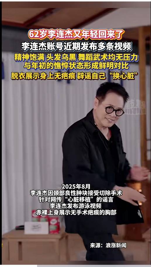 此前,李连杰曾因颈部良性肿块接受手术切除。在其11月1日发布的一条名为“这是一个坦诚相待的周末”的vlog中,李连杰晒出自己游泳的日常,并脱衣展示无疤痕上身,侧面辟谣其“换心脏”“心脏移植”等传闻。