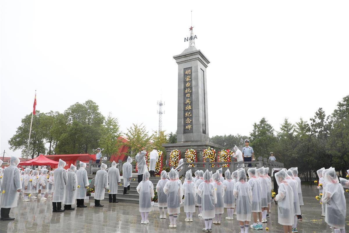 细雨霏霏中,苍松翠柏掩映下的胡家台抗战纪念广场,五星红旗迎风飘扬,抗日英雄纪念碑巍然耸立。200余名干部群众代表手持鲜花,面向纪念碑列队肃立。